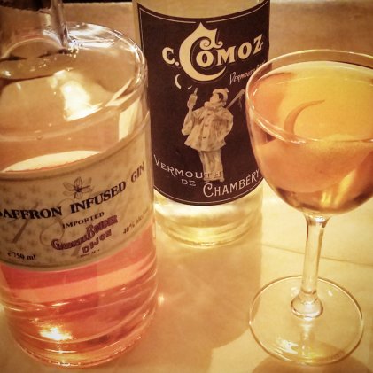 I felt inspired by the Vesper martini, and I particularly like the C.Comoz Vermouth Blanc to balance with the Boudier Saffron Gin. The C. Comoz is more light bodied, soft, and floral than the typical call for Lillet Blanc in this cocktail. I add a few drops of orange bitters, a half ounce of vodka and finish with a lemon twist. Since I’ve adjusted the recipe it seems fitting to adjust the name. I’m looking down and the pink shiny color of a brand new penny is reflected in my nick-and-nora glass… hmmm, maybe we should call this one the Moneypenny?
